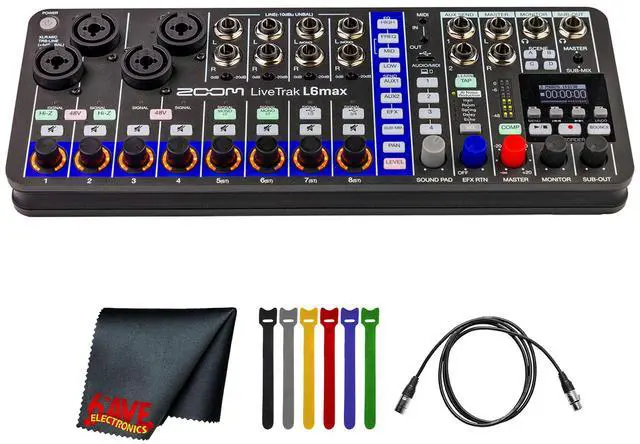 The Zoom LiveTrak L6max combines the power of a full studio mixer with the flexibility of a portable multitrack recorder, making it a strong choice for musicians, podcasters, streamers, and hybrid performers. Its 12-channel layout features four combo XLR/TRS inputs, including two with Hi-Z for guitars, plus eight line inputs for synths, samplers, or audio players. A customizable Sub-Out mix, two headphone outputs, and a -20 dB pad on channels 58 provide control when managing loud instruments or modular systems. Capture up to 14 total tracks to SD cards up to 2TB, including a stereo master mix and 12 isolated channels for precise editing. Unlimited overdubbing on the bounce track supports songwriting and arrangement building, while clip-free 32-bit float recording with dual-AD converters preserves every detail from quiet passages to high-energy performances. AI noise reduction keeps recordings clean by reducing hums, hisses, and room noise without degrading the character of the source. Creative processing includes a 3-band EQ on each channel, Reverb, Delay, and Echo with TAP tempo, plus a master compressor to add depth and punch. The L6max doubles as a 12-in/4-out USB interface and functions as a DAW control surface, providing seamless integration with studio workflows. With three power optionsAA batteries, USB, or Eurorackthe L6max adapts easily to home studios, mobile rigs, and electronic performance setups.