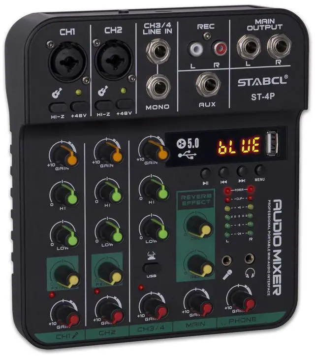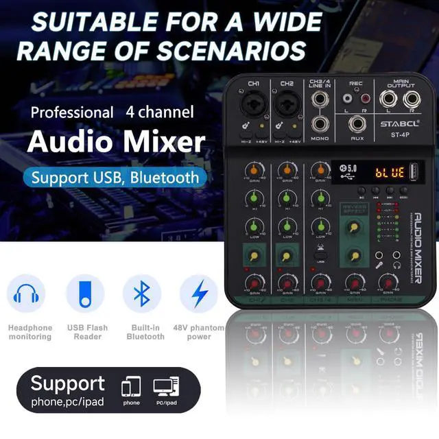 4 Channel Audio Mixer Board, Sound Board Mixing Console with Digital USB Bluetooth 48V Phantom Power and Echo, Small Sound Mixer Interface for Pc, DJ Mixer for Podcasting