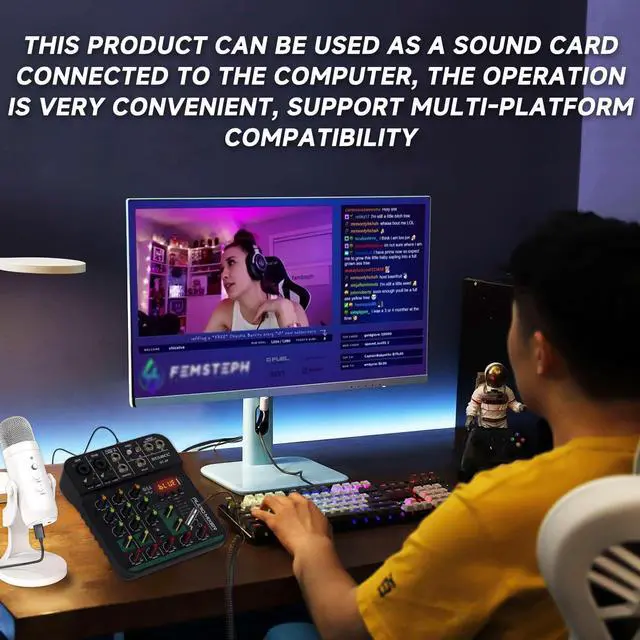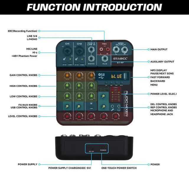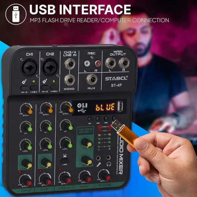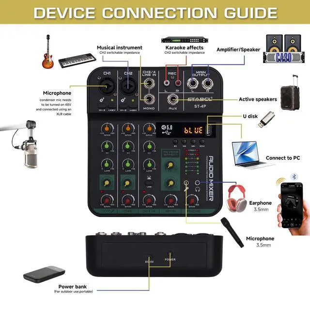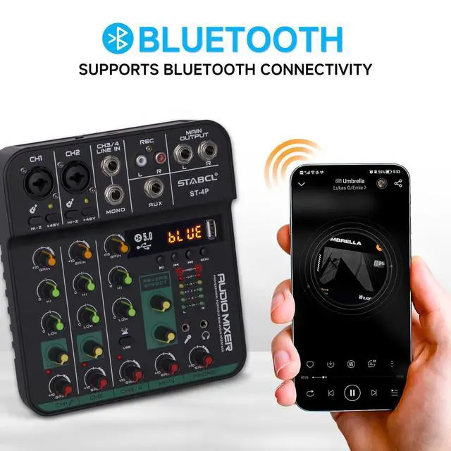 • Multiple CompatibilitySupport 5v power supply 3.5mm condenser microphone and 3.5mm headphone jack. Built-in high-performance balanced adjustment dsp makes it easy to connect mobile phones and computers, which makes this DJ mixer very suitable for network anchors to broadcast live.