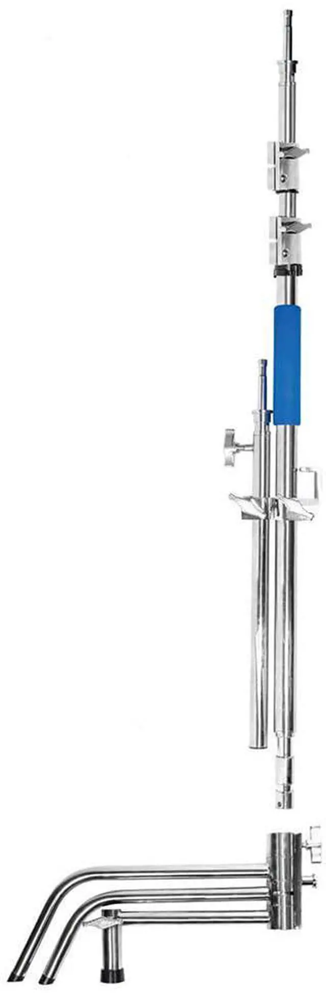 This feature also enables you to do more with less gear obstructing your workspace. The kit includes a 20" riser with a junior to baby pin that can be conveniently stored on the side of the 40" riser when not in use. This riser can be mounted into the leg's junior receiver for double action, enabling you to mount two lights or one light and a scrim onto both risers, maximizing the utility of a single C-stand. The 40" Stainless Steel C-Stand also features fast-acting, foldable legs on a turtle base that can be easily opened, closed, and locked with a pull-release knob.