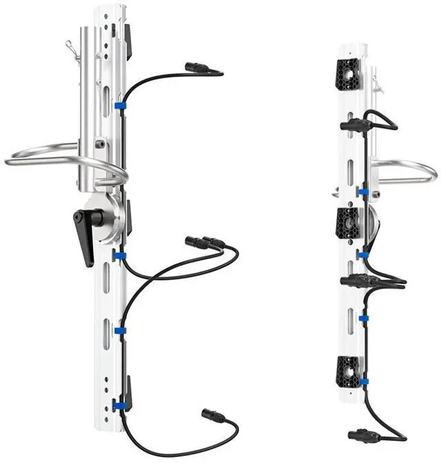 The X23 Modular Frame is a system that allows the mounting of three X21 fixtures in an array. The system includes aluminum profiles with integrated daisy chain cabling for Ethernet and power, yoke adapters, large stainless-steel handles, high strength tilt locks and robust tilt lock levers. Each frame includes three Quick-release brackets that are optimized for use with Hyper Optics but are adjustable in distance when used with other front attachments; the product also includes an angle indicator close to the side lever. The Modular Frame can be used as individual items, rigged via standard 28 mm spigots with C or half-pipe clamps, or can be inserted in the X Modular Yoke for a seamless stirrup format.