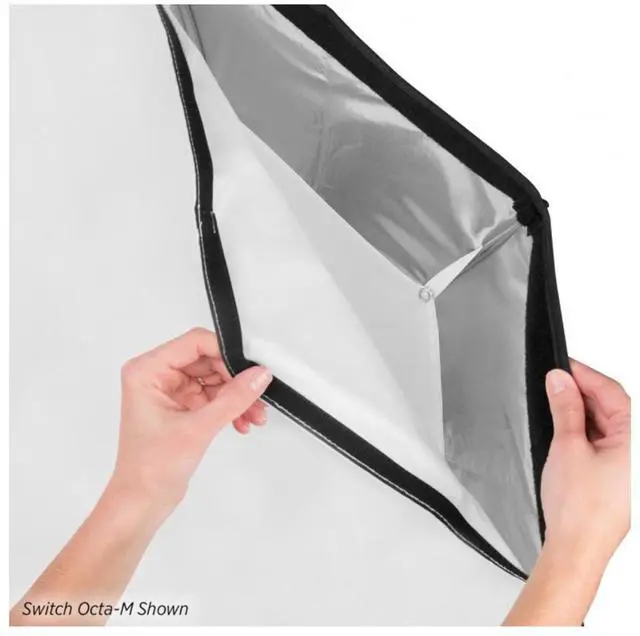 It offers professional-grade light modification without the hassle of tedious setup. Its diffusion panels are crafted from all-natural, unbleached nylon fabric, ensuring your light source is softened without altering its color temperature. The optional Deflector Plate is a must-have accessory that minimizes hot spots and creates a stunning beauty-style light output. These plates are designed for easy use with all Rapid Box softboxes. The Rapid Box Switch Octa-M is thoughtfully designed with an external mount for your speedlight or strobe. This allows for quick access to controls and the ability to utilize line-of-sight (or optical wireless) functionality.