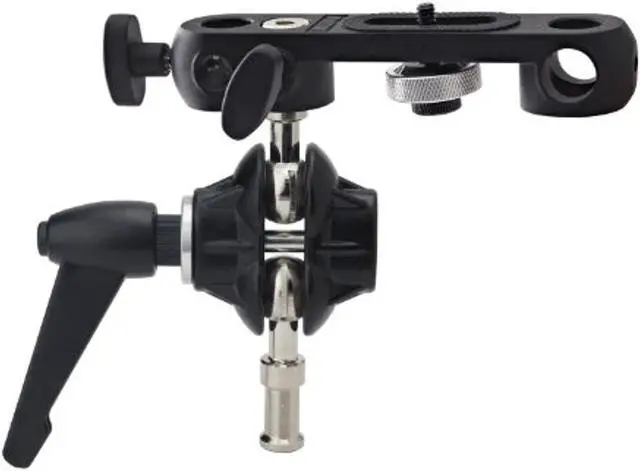 When it comes to reliable and versatile camera equipment, the Kupo Double Ball Joint Adapter with Dual 5/8" Studs and Camera Bracket stands out. This sturdy and adjustable mounting solution is designed with a double ball joint, securely fastened by a ratcheting handle. It features two 5/8" (16 mm) studs on either side, enhancing its versatility and compatibility with various camera setups. One of the studs is tapped with a 1/4"-20 female thread, while the other boasts a 3/8"-16 female thread. This unique design offers a wide range of mounting options, catering to the diverse needs of photographers and videographers.