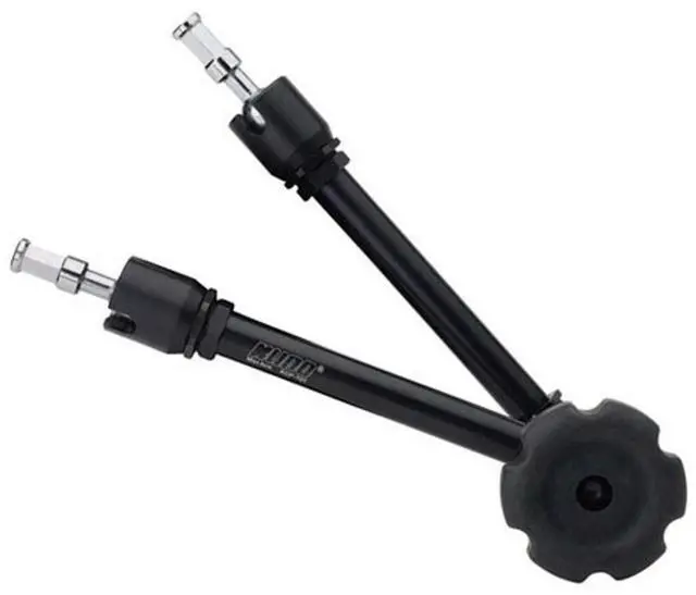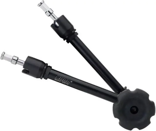 The Kupo Max Arm with Hand Wheel is an adjustable arm that allows you to position a camera, lighting fixture or accessory in any position within seconds. The two 0.62" (16mm) studs at either end are attached to ball joints that rotate 360 degrees, plus a cut-out in the sleeve surrounding the ball allows the stud to be bent 90 degrees. One stud is tapped to receive a 3/8"-16 thread, while the other is tapped to receive a _-20 thread. Each stud has six milled flat surfaces, so whatever you mount on the Max Arm will not rotate.