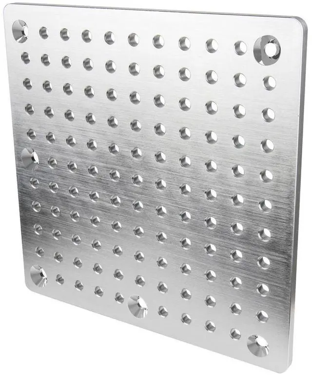 Its unique design, featuring counter-sunk 82-degree corners on one side, makes it an ideal choice for displaying artwork, hanging tools, or even serving cheese and crackers at your next gathering. Easy to clean and resistant to corrosion, this stainless steel cheese plate is as suitable for outdoor events as it is for indoor use. Whether you're a film professional looking to streamline your setup or a homeowner seeking a versatile serving plate, the 12x12" Square Cheese Plate with 3/8" Holes is a high-quality solution that combines style, functionality, and durability.