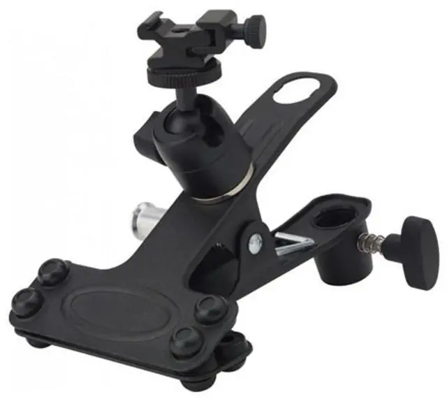 Bring precision and ease to your off-camera flash setup with the robust Off Camera Flash Alli Clamp. Designed to cater to the needs of professional photographers and videographers, this clamp is the epitome of durability and versatility. Its sturdy construction ensures a reliable grip on both round and flat surfaces, accommodating a maximum jaw diameter of 1.57 inches and crafted from high-quality black metal. The clamp features a 5/8" baby stud, precisely tapped with a 3/8"-16 female thread, and includes a baby receiver, offering a multitude of mounting possibilities. The adjustable mini ball head and hot shoe adapter enhance its functionality, allowing for swift and secure positioning of your lighting equipment.