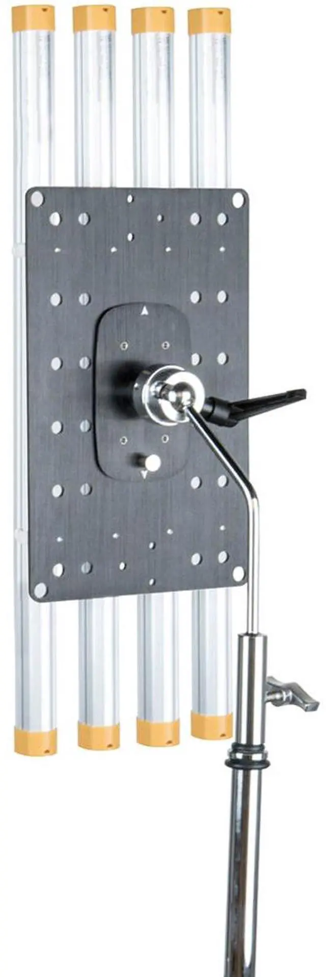 Moreover, this mounting plate can be used with a cheese plate or a V lock set for battery, further expanding its utility in various lighting scenarios. Whether you're shooting in a studio or on location, the Twist-Lock Mounting Plate for Four T12 Lamps offers a reliable solution for your lighting needs. Its robust construction and versatile design make it a valuable addition to any professional camera and lighting equipment collection.