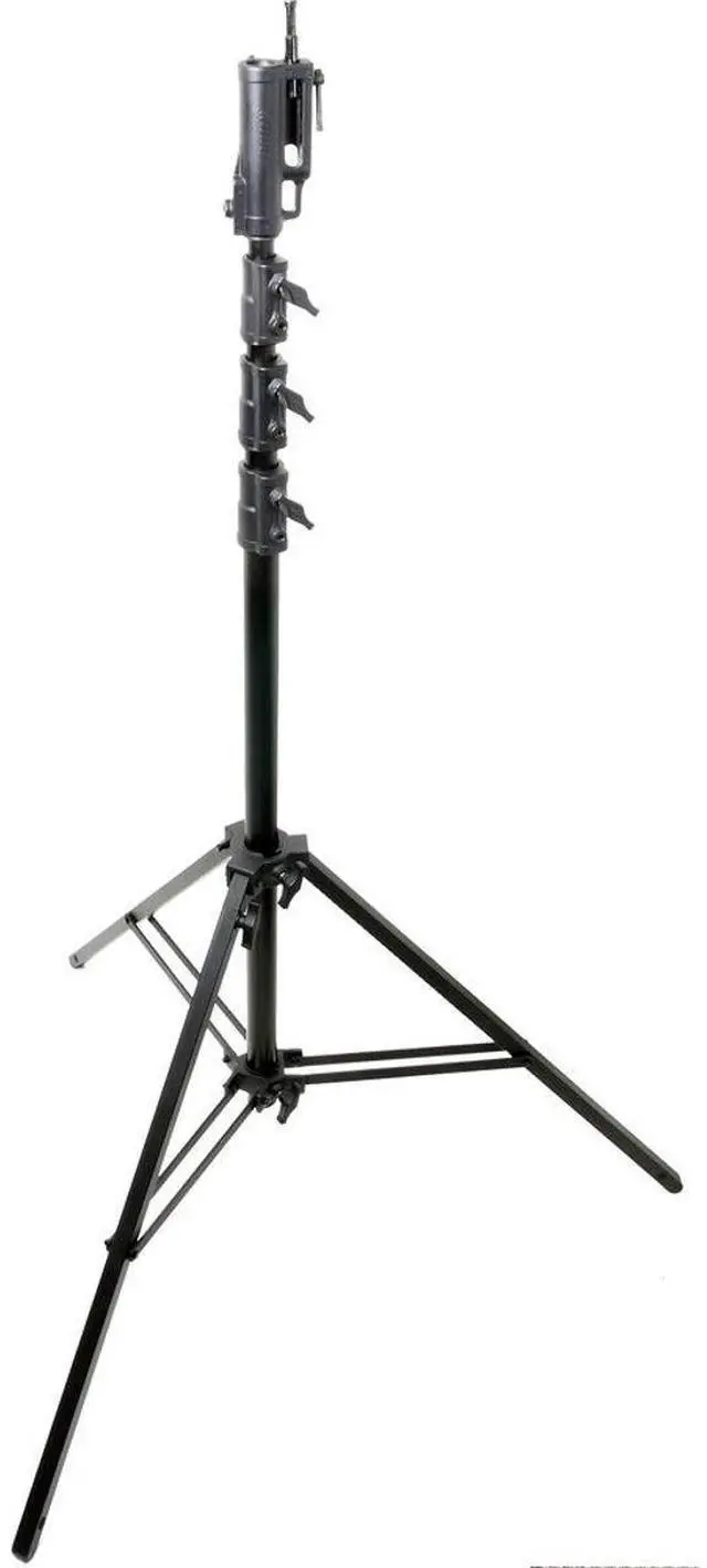 Before you settle for any ordinary stand, consider the Kupo 4-Section Master High Cine Stand in sleek black. Engineered with a robust all-steel construction, this stand promises durability and reliability, even under heavy loads. It's designed to support equipment weighing up to 88.2 lbs (40kg), making it an ideal choice for professional photographers and videographers. This high-quality cine stand boasts a 3-riser, 4-section design, allowing it to reach a maximum working height of 175.1 inches or 14.6 feet. This adjustability makes it a versatile tool for various filming or photography projects, from low-angle shots to high overhead lighting setups.
