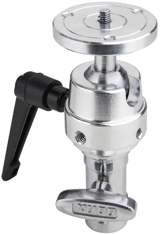 The grip head is designed with rotating aluminum discs and features four different sized "V" shaped jaws, capable of securely holding accessories with 5/8", 1/2", 3/8", or 1/4" mounting studs or tubing. Enhancing the kit's versatility, the Super Grip Finger with Round Camera Plate is crafted from heavy-duty metal and includes a ball head with a 1/4''-20 thread male stud. This allows for flexible positioning of the camera on the stand or any equipment with a 5/8" (16mm) baby stud or 1-1/8" (28mm) junior receiver, providing a wide range of shooting angles and perspectives.