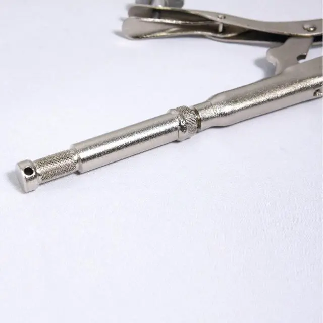 The Kupo Chain Clamp with Dual Baby 5/8" Studs consists of a pair of pliers with a 10" length of chain that can be wrapped around odd shaped objects such as a tree branch. This clamp features two baby 5/8" (16mm) studs, one mounted on the back of the clamp and another at a right angle at the end of the handle that is used to adjust the tension when locked down. The studs have a knurled texture to prevent fixtures from rotating when locked in place. The release lever has a set-screw with a knob to prevent accidental opening of the clamp when locked in place.
