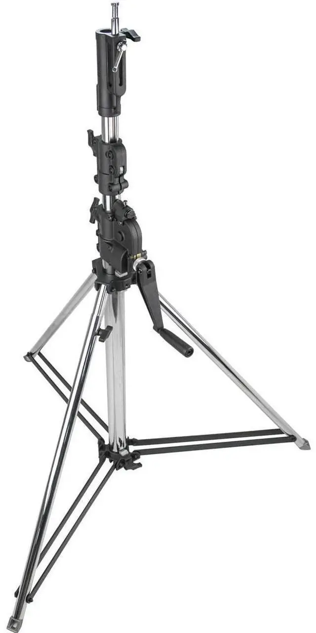 Make your photography and videography sessions more efficient and safe with the Short 3-Section Wind-Up Stand, 8.6 ', Chrome. This high-quality stand, constructed from chrome-plated steel, is not only sturdy and durable but also offers excellent resistance to corrosion, ensuring long-lasting use. Designed with a geared column, this reliable stand allows a single operator to raise and lower heavy loads of up to 60 to 69 lbs with ease. Just a simple turn of the handle elevates both risers simultaneously at a rate of 4.4 cm per handle turn, providing you with the versatility to adjust your lighting equipment to various heights.