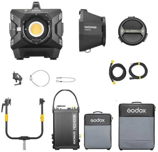 Godox MG2400BI: A High-Power Draw Light with Adjustable CCT Range, The Godox MG2400BI is a high-power draw (2600W) light. It has an adjustable CCT range of 2700K to 6500K and uses the Godox G mount. The G mount features connector pins like you would find on the ARRI Orbiter, that communicate information between the light and the lighting modifier that is attached to it. There will be a myriad of lighting modifiers available, including a Fresnel. The light features an IP 54 rating and the light head weighs 20 kg / 44 lb and the power supply/controller weighs 30 kg / 66 lb. Exceptional Performance & Color Rendition The MG2400Bi provides flicker-free operation and professional-quality color rendition. The color temperature range from 2800 to 6500K means you can quickly match ambient lighting conditions or other fixtures. Multiple Control Methods A variety of control methods allow you to adjust and control your light effortlessly and simplify your workflow. Control the fixture wirelessly via LumenRadio CRMX or Ethernet, which supports the Art-Net and SACN protocols. Meticulous & Powerful Cooling System A powerful cooling system ensures rapid heat dissipation that is quiet enough for sound-sensitive situations.