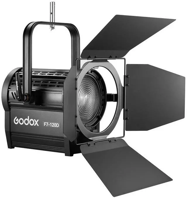 For professional photographers and videographers seeking a durable and high-quality lighting solution, the F7-120 120W Daylight Fresnel Light with Hang Mount by Godox is a top-tier choice. This robust and versatile light fixture is engineered to deliver exceptional daylight-balanced illumination with a precise color temperature of 5600K, making it ideal for capturing the true essence of your subject under natural-looking light. Crafted with a high-quality 7-inch Fresnel lens, the F7-120 ensures an even distribution of light, providing a bright and consistent spot with soft lighting effects. This advanced lens design also maximizes light efficiency, achieving an impressive illuminance of up to 71, 100 lux at a distance of 1 meter, which is perfect for both studio and on-location shoots.
