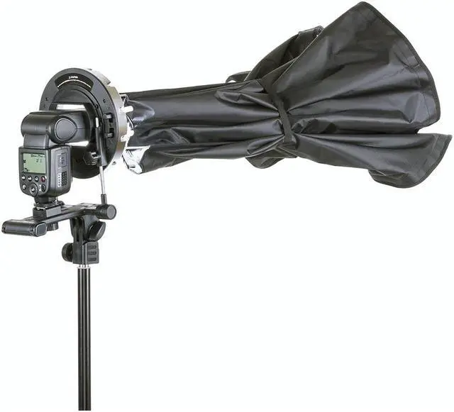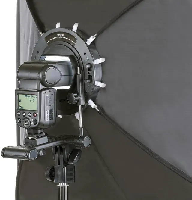 The softbox collapses easily with twin safety tabs, producing a signature 'pop' sound, making it a dynamic and portable solution for softbox lighting. This innovative product is compatible with five popular speedlights, monolights, and studio strobe heads via custom interchangeable rings. The QuadraPop and ParaPop mobile softboxes can accommodate multiple lights, making it a versatile addition to your photography equipment. The QuadraPop 24X34" Portable Softbox is designed with a special bracket for hot shoe mounted speedlights, aligning the flash precisely and predictably. The softbox offers exceptional light efficiency with virtually no fall-off from edge to edge, thanks to the use of UV-A and UV-R diffuser materials and an internal silver reflector fabric that rivals all other flexible materials.