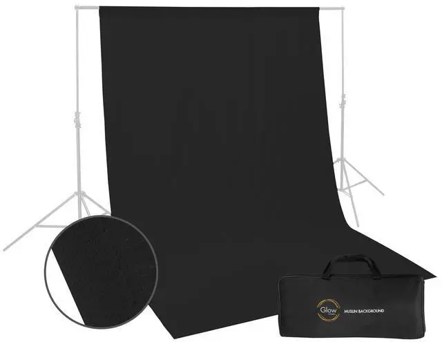 Bring your photography to the next level with the Glow 6x9 Black Muslin Background. Crafted from 100% cotton, this non-reflective, richly colored fabric offers a seamless, professional-grade backdrop for all your photographic needs. With its generous 6x9 size, it's perfect for full-length shots of children, product photography, or any subject requiring a continuous, uninterrupted background. This high-quality muslin background is versatile and adaptable. It can be crushed to create a strong textured effect, or carefully folded or rolled for storage to avoid creasing. The sewn 3.5" rod pocket at the top easily accommodates a cross pole support system, making setup a breeze.