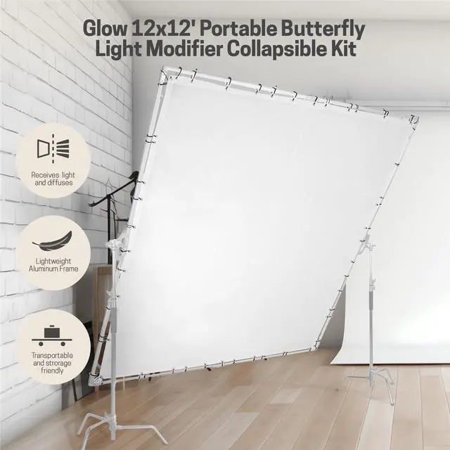 The Glow 12X12 Butterfly Scrim Kit tackles the most daunting lighting challenges out there - even lighting to bathe a vast area, without special modifiers on the source. It receives your light and diffuses even the most severe, direct light changes into a gentle and controllable source for still or video photographers. The 12x12' Butterfly consists of a collapsible aluminum frame that can be easily assembled and fitted with an efficient light modifying, light diffusion screen, to transform any intense light source from hard to soft, natural to artificial. The sheer size of our 12x12 Butterfly Scrim helps the master the harsh nature of a powerful light source into a wide variety of diffused illumination solutions.