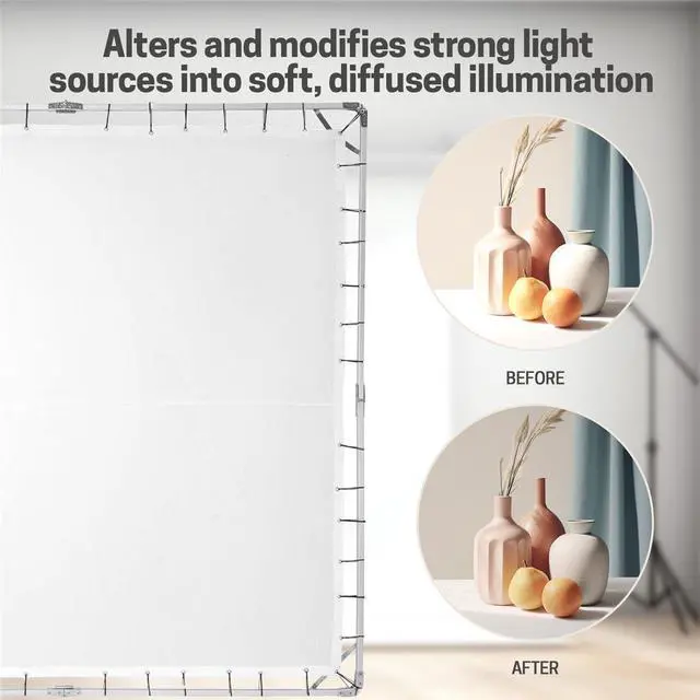 When secured with weights or sandbags outdoors, it reduces the intensity of any sunlight and filters softly on subjects being filmed or photographed. In the studio, careful placement of the scrim to the subject or light to scrim surface, anyone can control the properties of diffusion and reduction of strength to achieve flattering portraits and fashion images