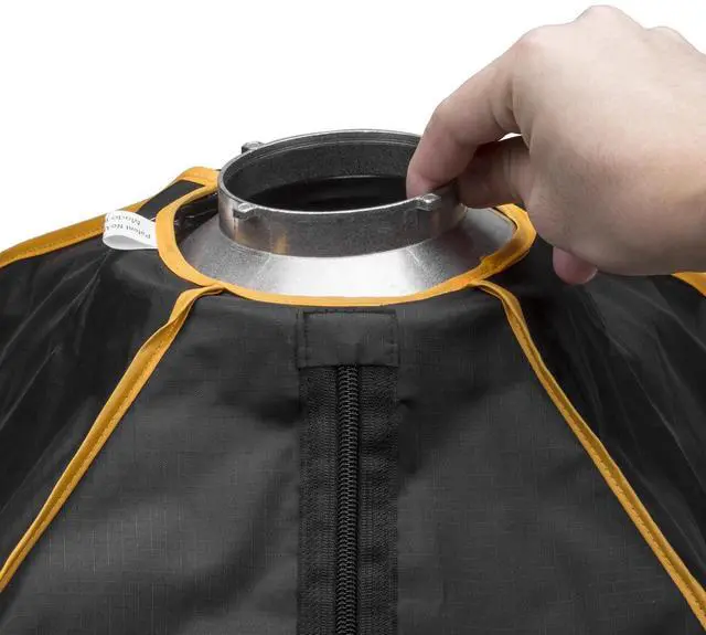 The Glow EZ Lock 130mm Speedring Insert mounts swiftly onto the flash head, enabling your flash to attach to any Glow EZ Lock Softbox. This easy-to-use system enhances practicality, strength, and speed, simplifying the often daunting task of quality light modification, whether you're on the go or in the studio. The self-catch EZ Lock design features a thick center shaft, offering a comfortable grip for your fingers to push-lock the mechanism open, and a generous release to close the softbox effortlessly. Attention to detail is evident in its sturdy build, from the resilient form-fitting fabric to the flexible aluminum frame ribs.