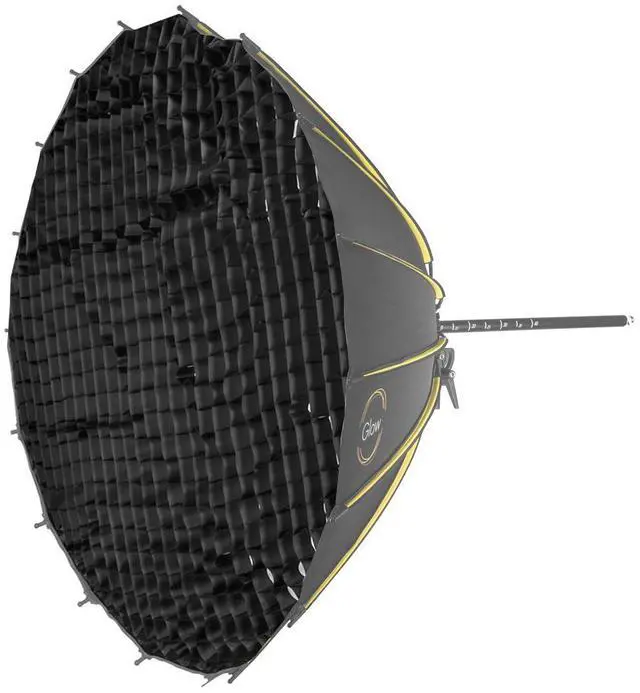 What you have here is the Glow 55" Eggcrate Grid, specifically designed for the Profond Quick-Open 55" Deep Parabolic Softbox with Focusing Rod System. This essential lighting accessory is a game-changer in the realm of professional portrait photography. When fitted over the aperture of the parabolic softbox, the eggcrate grid gives you unparalleled control over the directionality of your light source, effectively minimizing light spill on the subject's body and the background. This powerful feature allows you to create high-key depth in fashion photography, accentuating the model's facial features such as the eyes, lips, nose, and chin.