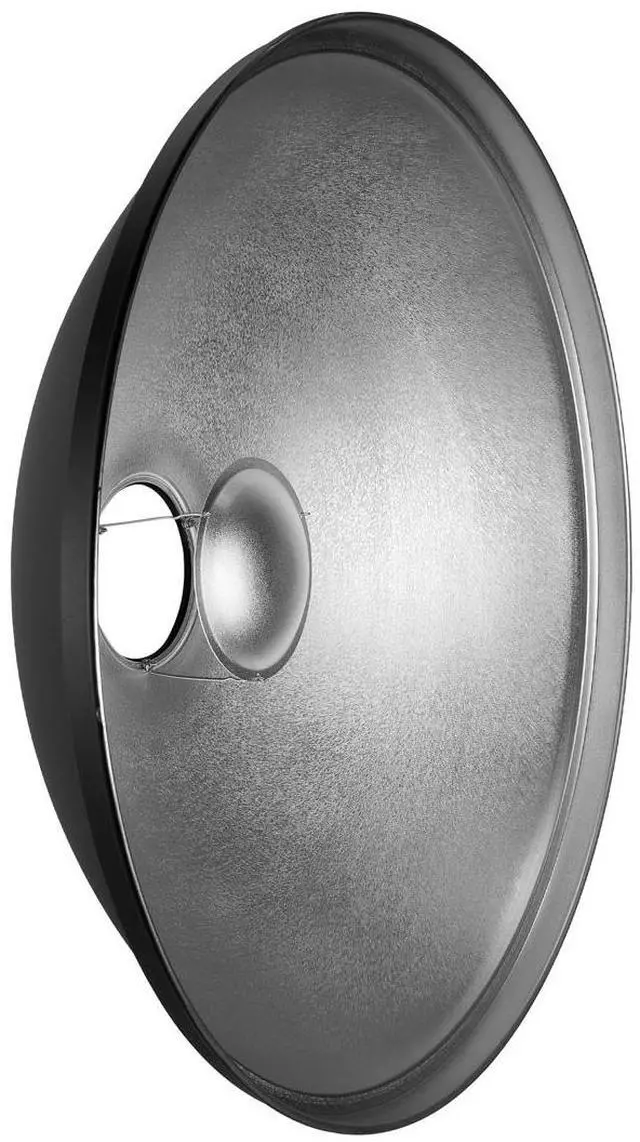 The 28" Silver variant is ideal for everything from head and shoulder portraits to full-figure studies, even in tight spaces where softboxes and umbrellas may not be suitable. The design of the beauty dish includes a small opaque reflective cover suspended over the light source, preventing direct light from hitting the subject. The light bounces off this small interior disk and floods the larger bowl of the beauty dish, resulting in a softer light cast than a standard reflector and significantly less harsh than a speedlight. The position of the small center reflector cap can be adjusted to control the spread to the large bowl and accommodate tall or high wattage modeling lights.