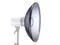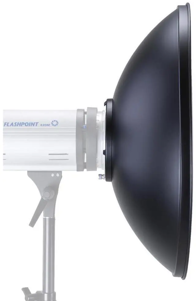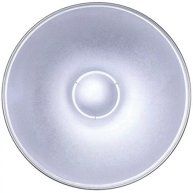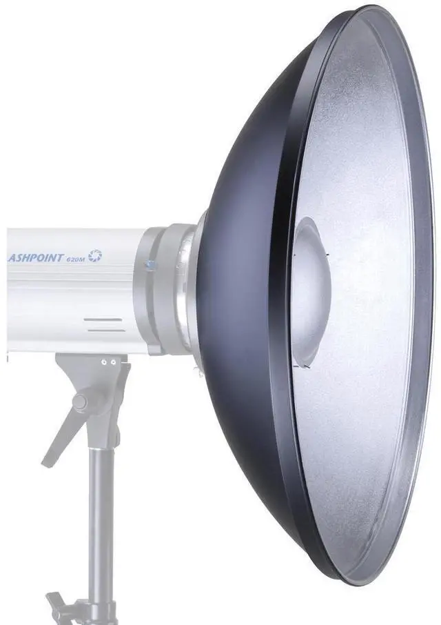 The 28" Silver Beauty Dish is perfect for a wide range of photography needs, from head and shoulder portraits to dramatic full-figure studies. It's especially useful in tight spaces where traditional softboxes and umbrellas may not be effective. The design features a small opaque reflective cover suspended over the light source, preventing direct light from hitting the subject. Instead, light bounces off the interior disk and floods the larger bowl of the beauty dish, creating a softer light than a standard reflector and reducing the harshness of a speedlight. The position of the center reflector cap is adjustable, allowing you to control the spread of light and accommodate tall or high wattage modeling lights.