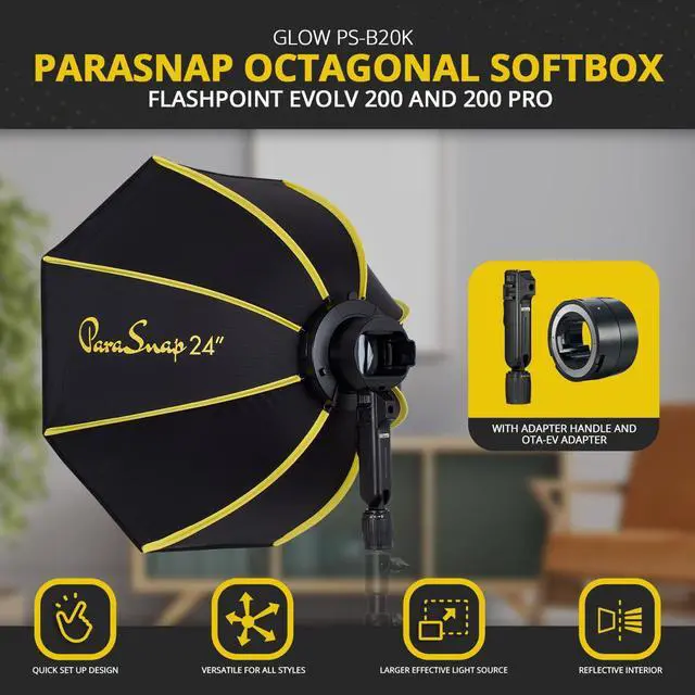 Please note, it is not compatible with the new Flashpoint eVOLV 200 Pro II. The adapter supports a range of accessories available for the OTA ParaSnap System, such as a 40 Degree grid, diffuser, or color correction filter kit, offering enhanced creative control and precision. A standout feature of the ParaSnap is its rapid setup mechanism. With a single motion, the softbox expands and locks into its classic octagonal shape, significantly reducing setup time compared to traditional softboxes. This design is favored by photographers for its ability to produce even lighting and round catchlights, adding a professional touch to your images.