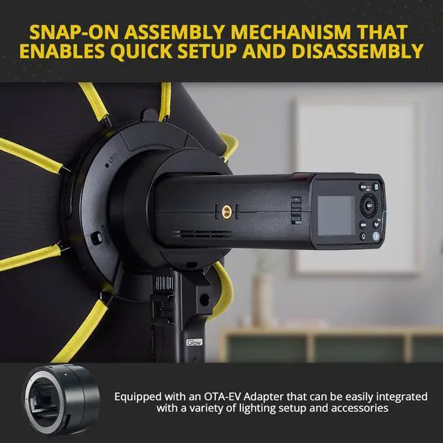 Note that this version of the Glow ParaSnap Octagonal Softbox does not include the OTA Adapter. For universal compatibility with strobe lights and easy switching between modifiers, the OTA Adapter is sold separately and can be added to your setup based on your specific needs.