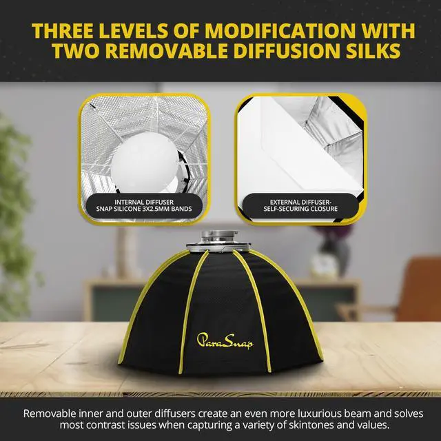 This quilted fabric interior optimizes and maximizes your light output, eliminating hot spots and light loss, and is particularly effective for capturing all skin tones. The ParaSnap also includes removable inner and outer diffusers, creating a luxurious beam that solves most contrast issues when capturing a variety of skin tones and values. The result is heavenly lighting, with round catchlights in the subject's eyes. The ParaSnap is the perfect size for on-the-go portraits, offering terrific portability and adaptability to serve on all sorts of monolights. Switching speedrings to fit a variety of studio and speedlight standards is a breeze with tool-free ease.