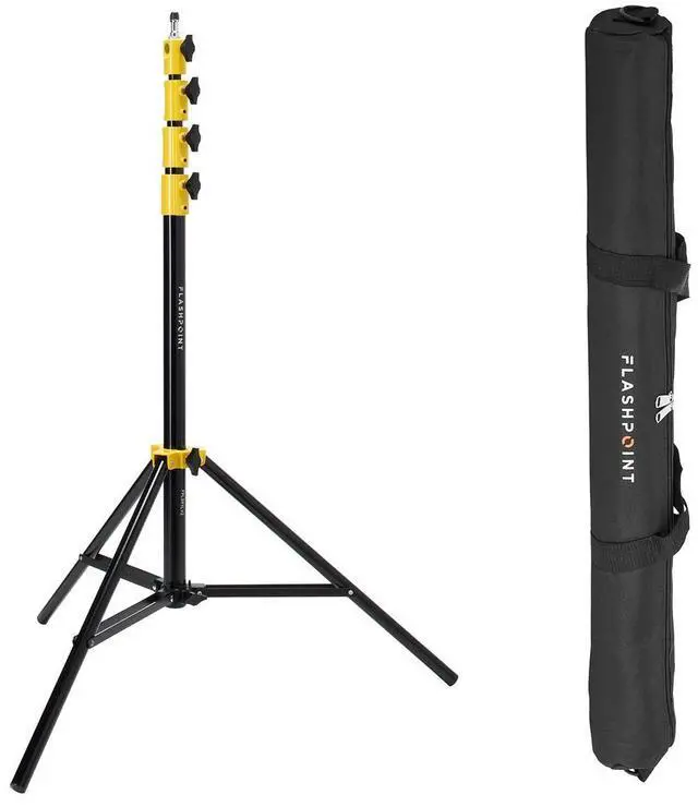 The bundle includes the Glow EZ Lock 24x36" softbox, external and internal diffusers, eggcrate grid, Bowens mount speedring adapter, reversible deflector disk, storage bag, and a 2-year USA warranty. It also comes with the Flashpoint Pro Heavy-Duty Air-Cushioned Light Stand (Yellow, 9.5 '), which features a robust aluminum build, a wide 2.9 -foot footprint for stability, a load capacity of 15\u201316 lbs, and an adjustable height range from 3.43 feet to 9.5 feet, providing secure and flexible support for a variety of lighting setups