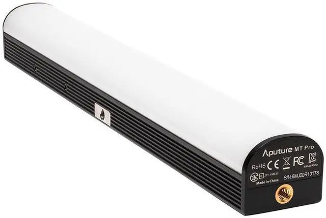 SSI (Tungsten): 84. It comes loaded with 9 System FX and 7 Pixel FX, plus advanced features unique to the Aputure and Amaran ecosystems, such as Picker FX and Custom FX. These can be stored using the Sidus Link app for easy access to different light modes. For ultimate creative freedom, the MT Pro offers critical color controls, including advanced HSI with white-point adjustability, xy, and RGB, and professional options like LumenRadio CRMX for wireless DMX and RDM controls. Its robust construction, lightweight 391g aluminum housing, and built-in USB-C rechargeable battery that can power the MT Pro at its 7.5W max output for 120 minutes, all attest to Aputure's high standard for build quality. The MT Pro's ultra-thin bezels and a 180-degree aperture allow for greater lighting coverage and can be used as an in-camera practical. Its integrated magnets, the included mini tripod, or collapsible 45-degree light control grid offer additional versatility and control across all shooting environments. The MT Pro's compact size, magnets, and built-in battery make it easy to conceal from the camera, while still allowing for remote control using LumenRadio CRMX or direct Sidus Link App Control.