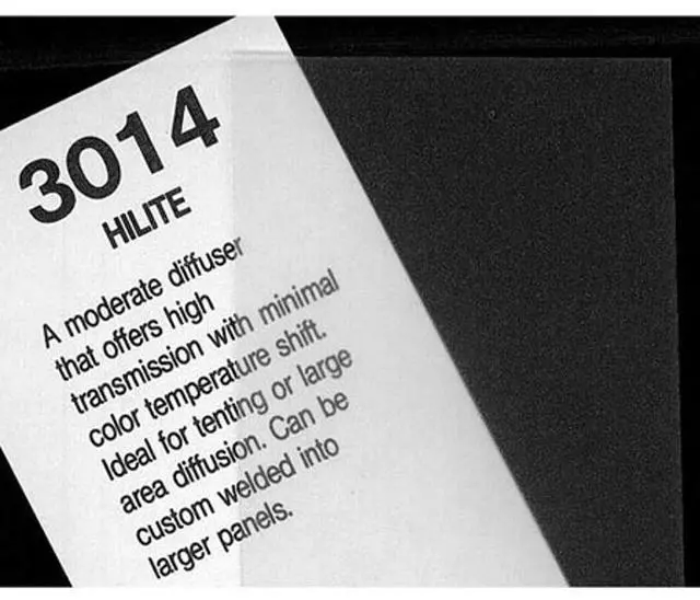 Enhance your photography and filmmaking projects with the Cinegel Hilite, a 20x24" Sheet of Light Diffusing Material by Rosco. This high-quality, durable light diffuser offers superior light transmission with minimal color temperature shift, making it an essential tool for professionals seeking to create a soft, even lighting effect. Designed for versatility, the Cinegel Hilite is ideal for a range of applications, from tenting to large area diffusion. Its efficient design allows it to be custom welded into larger panels, providing you with the flexibility to adapt to any lighting scenario.