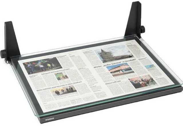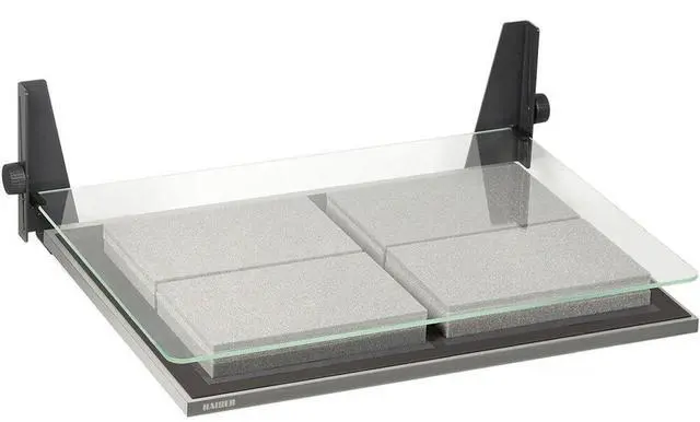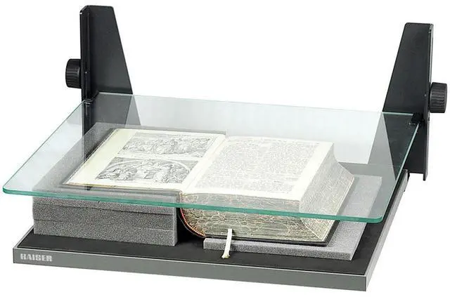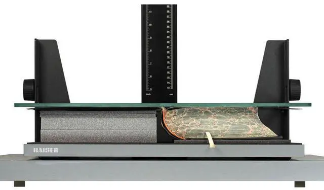 Holding device with glass pressure plate for the exact positioning when doing copy work from books, magazines and newspapers. In the photo lab the book holder is also suitable for making contact prints from negatives on photographic paper and for alternative photographic processes using contact printing. Solid base plate with non-slip coating on top and non-slip feet underneath. 6 mm ( 0.2 in. ) thick glass pressure plate, foldable and variable in height. To work more ergonomically, more efficiently and original-friendly at a particular height, you can lock the glass pressure plate into a position between 0 and 145 mm ( 5.7 in.