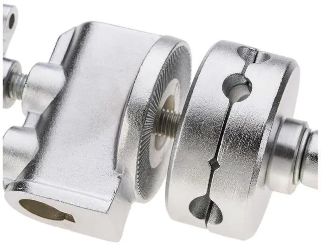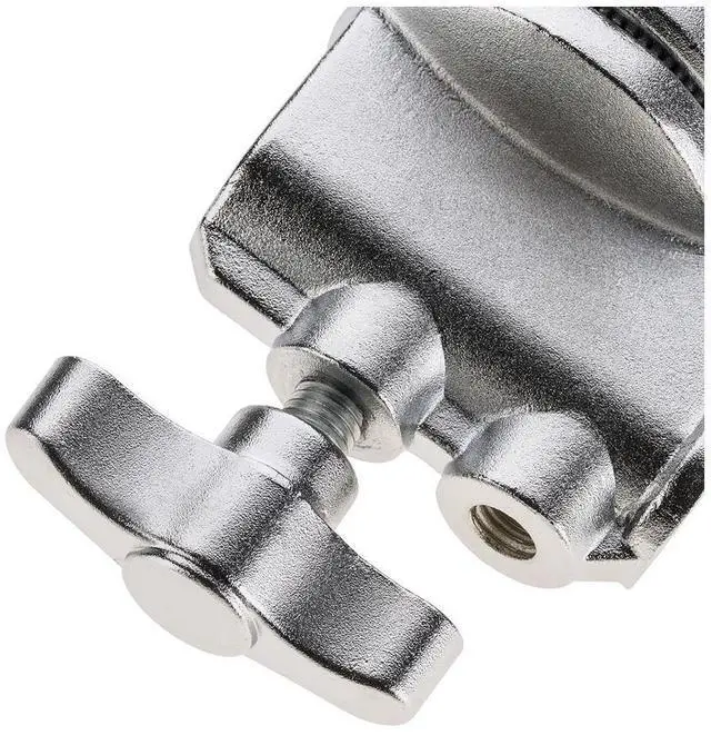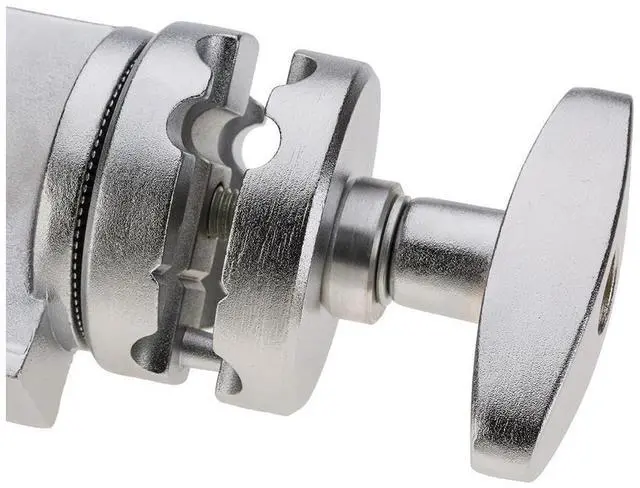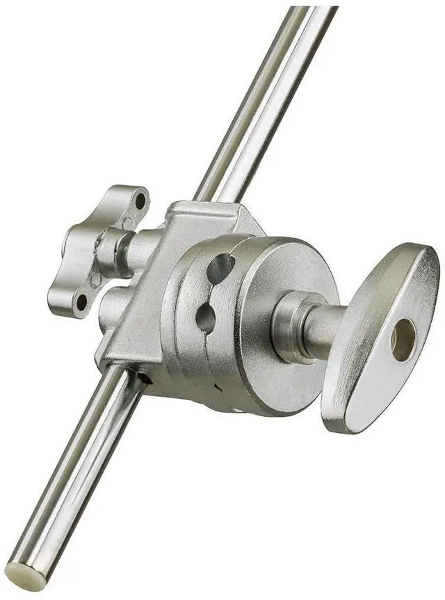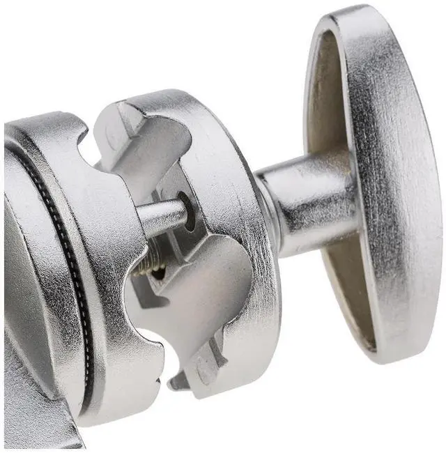 The jaws of the grip head are capable of opening up to a maximum of 1-1/8", allowing it to firmly grasp rods, dowels, and studs with confidence. The design of the channel disks is both intelligent and functional, pivoting around the central tightening handle and featuring grooves that enhance friction for a steadfast grip. This reliable grip head is compatible with light stands, attaching via a 5/8" baby pin receiver hole. It offers two positions for the tightening grip handle, optimizing its use with either standard light stands or the longer baby pin ends found on Century Stands.