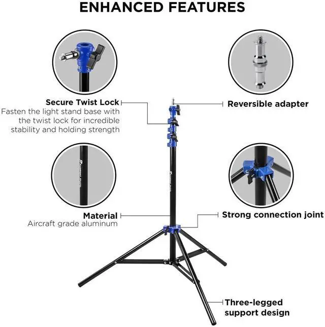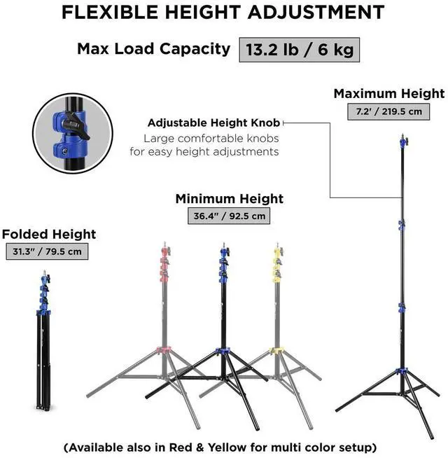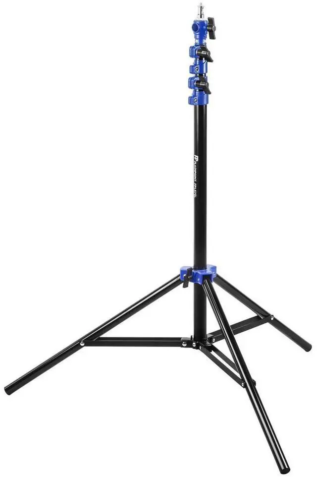 The Flashpoint 7.2 ' Air-Cushioned Light Stand is crafted from lightweight and durable aluminum alloy with a matte black finish, accented with distinctive blue tier collars for color-coded individuality. Instantly identify your gear from the rest of the bunch. The support can handle up to 13.2 lb at the maximum height of 7.2 ' and features two 5/8" sockets to provide both vertical and horizontal mounting options. The included stud is engineered with traditional cylindrical ends and is enhanced with flat surfaces to ensure twist-free connection to devices. Three air-cushioned sections prevent sudden drops and assure a soft but sure close.