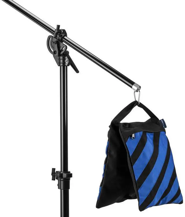 Explore the multifunctional capabilities of the Flashpoint Empty Saddle Sandbag, a must-have accessory for photographers and videographers alike. Sporting a stylish design of blue and black stripes, this bag is crafted from high-density, water-resistant Cordura nylon, a material renowned for its exceptional durability and resistance to wear and tear. Designed to securely anchor your gear, this sandbag is an invaluable tool whether you're in the field, on location, or in the studio. It serves as a reliable counterweight on light booms, ensuring stability and safety for your valuable equipment.