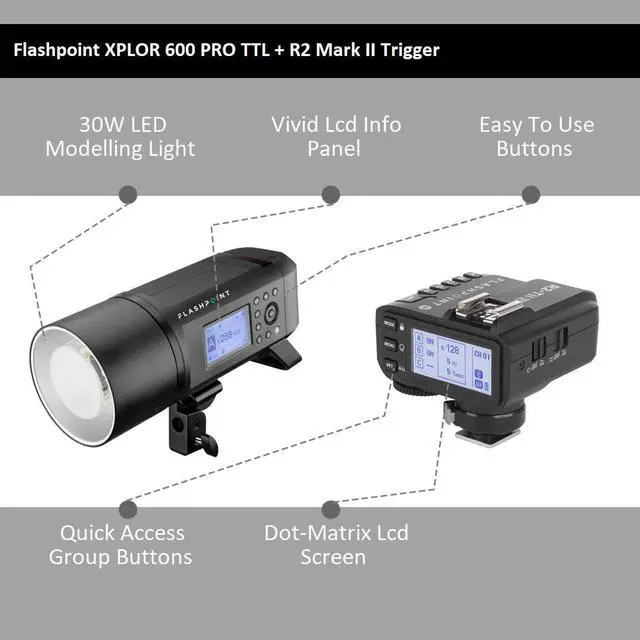 The XPLOR 600Pro TTL can be linked and synced to be triggered wirelessly in complete TTL operation with any R2 transmitting member of the R2 Family. The R2 TTL Wireless Flash System is the advanced 2.4GHz radio remote that adds camera TTL dedicated custom functions to your multi flash experience. R2 wireless communication gives speed of light response to on camera or off camera R2 Family devices for a spectacular advantage on the shoot in any environment.