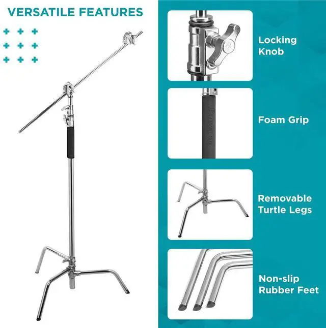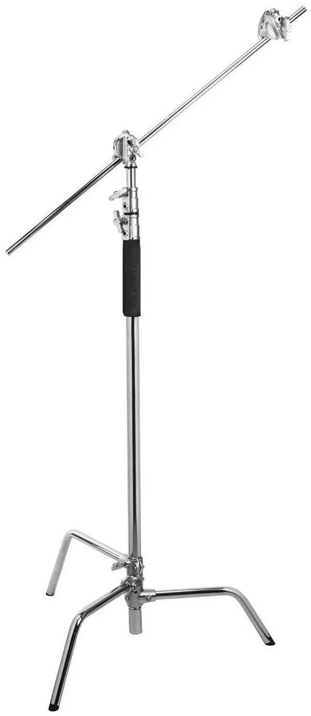 Individual legs can be swung to any angle, breaking out of fixed leg stance of classic stands. The 'Turtle Base' provides an exceptionally low center of gravity, balancing off axis gear without tipping the assembly, especially when secured with saddlebag style sandbags. The unique staggered curved leg design allows C Stands to be nested allowing for several to be used in close proximity. The lower leg can also be slid under many objects. The kit's extension gobo rod arm precisely slips into the aluminum 3.0" grip heads, supporting light modifiers, arms, scrims, cantilever flags, gobos or smaller lights, into exact position.