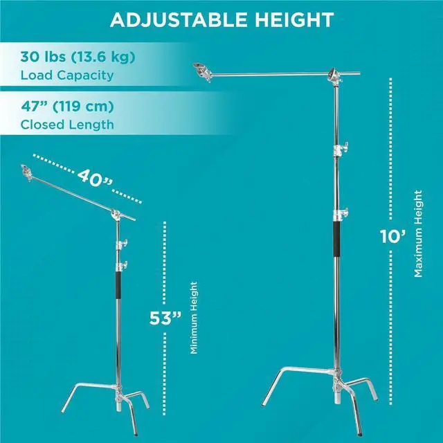 The Flashpoint 10' Century C Stand Kit is a worthy carrier of the time honored C Stand tradition of secure and powerful light and modifier supports for cinema and still studios. The C Stand kit features a 10', two tier spring loaded riser column with a baby pin on top, removable turtle self locking base legs, 2 aluminum 3.0" grip heads and a 40" extension boom arm. The stand base features a specially designed sure locking mechanism that is unique to the C Stand series. Each leg firmly sets to a preset lock position for easy swing setup and then flat for compact storage and transport.