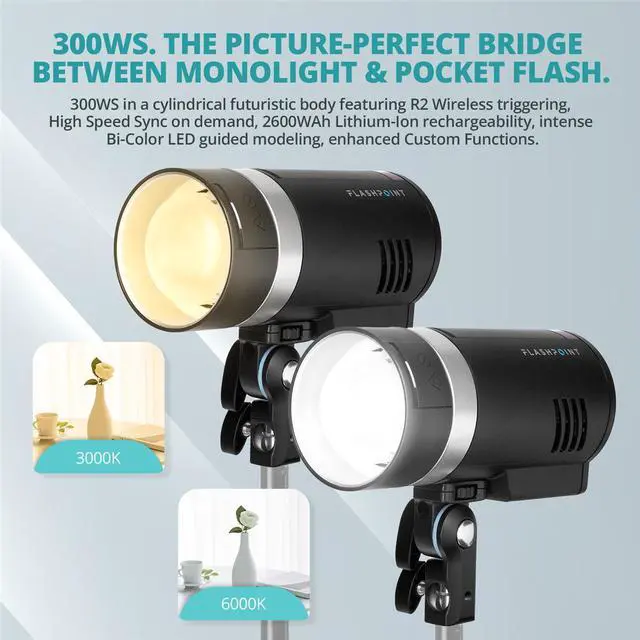 Flashpoint XPLOR 300 Pro. 300WS. The picture-perfect bridge between monolight and pocket flash. Smaller is better Compact is sweet Power is honeyYes, you can believe it. The ingenious freshest member of our world renowned R2 Family of Wireless Flash. 300WS in a cylindrical futuristic body featuring R2 Wireless triggering, High Speed Sync on demand, 2600WAh Lithium-Ion rechargeability, intense Bi-Color LED guided modeling, enhanced Custom Functions. TTL, Manual, and MultiStrobe modes. All in a sleek, restyled, profile that a Swede would appreciate. How many times can you fall in love? Wooed with the original StreakLight 360.