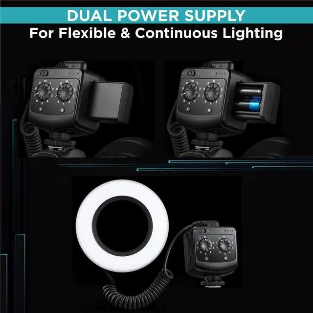 The Ring72 also features a dual power supply for maximum convenience, operating with either 4 AA batteries or a detachable lithium battery for extended runtime. Unique to the Ring72 is the separate brightness control for the left and right halves of the ring, allowing you to easily vary the contrast ratio of your pictures, create a side-lite effect, or add more tactile dimension.