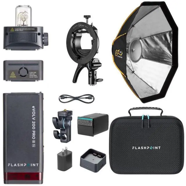 Boasting 200Ws of powerful output and a rapid recycle time ranging from 0.01 to 1.8 seconds, this compact flash is ready for any photographic challenge. The large-capacity battery supports full-time High-Speed Sync (HSS), allowing you to capture fast-moving subjects with ease. Choose between the speedlite and bare bulb flash heads, both equipped with bi-color LED modeling lamps, to achieve either soft, diffused light or more focused illumination. The kit includes a Glow EZ Lock Octa Small Quick Softbox (25") and an S2 Bracket, providing you with the tools needed for a versatile lighting setup.
