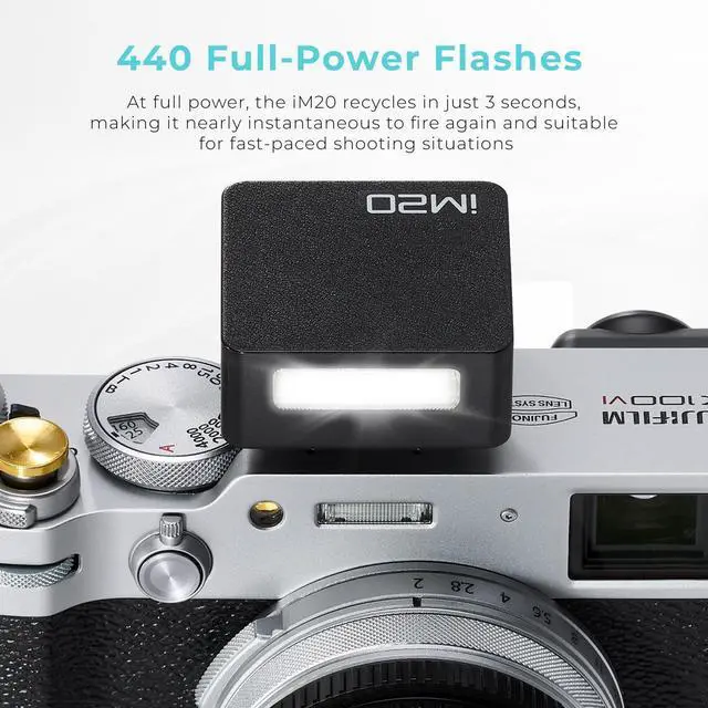 The iM20 is equipped with a built-in rechargeable lithium battery, providing up to 400 full-power flashes on a single charge. This dependable power source ensures the flash can keep pace with your shooting demands, whether you're embarking on a full day of adventures or a quick photo session. Recharging is straightforward, allowing you to focus on capturing the perfect shot.