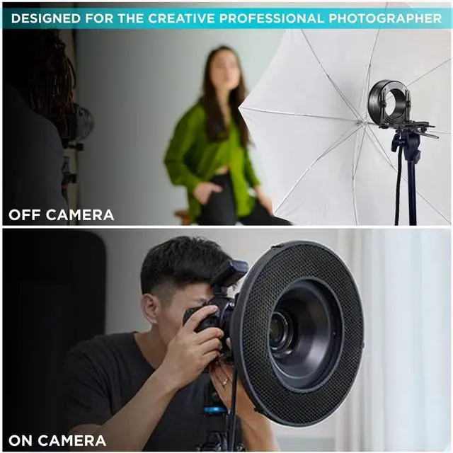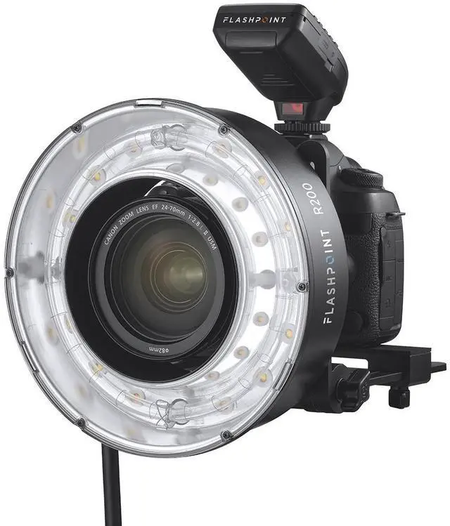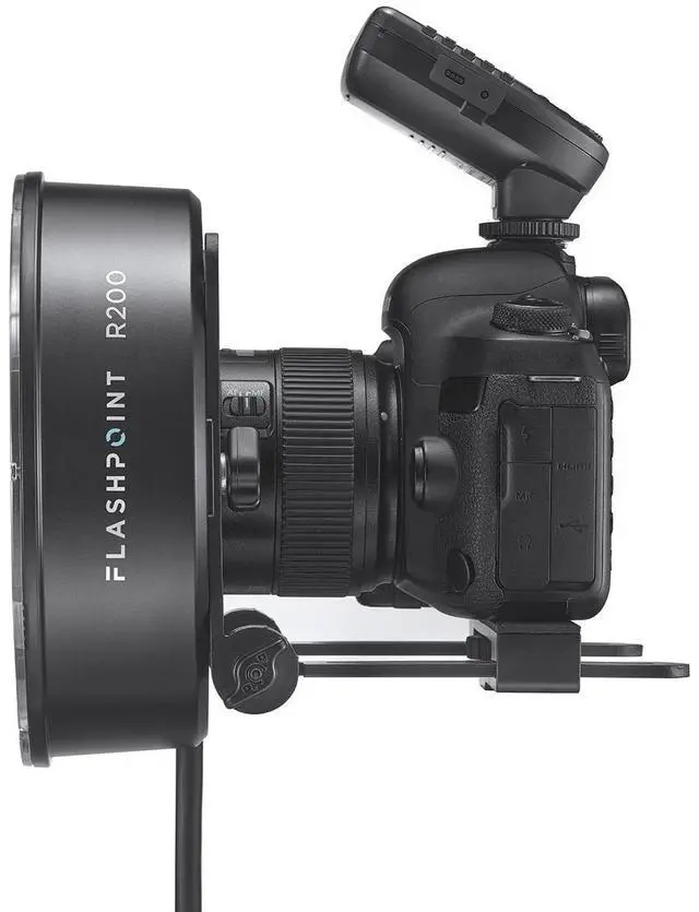 The Flashpoint R200 200ws Ring Flash Head for the eVOLV200 system also provides a sturdy mount for almost any camera or tripod-based studio setup. It can be used on-camera with the included adjustable folding camera bracket, or off-camera with or without an umbrella using the easily affixed umbrella bracket.