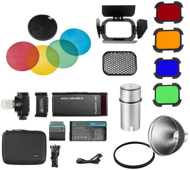 Seamlessly integrating with a wide range of camera systems, the eVOLV 200 Pro TTL is triggered by R2 Series on-camera and studio flashes in TTL, Manual, and Multi modes. This ensures accurate flash exposure in rapidly changing lighting conditions. The unit is designed to automatically recognize and adapt to Canon, Nikon, Sony, Fujifilm, Pentax, Panasonic, and Olympus systems, offering remote power control and seamless shooting experiences. The kit also includes the Flashpoint eVOLV200 Barndoor Kit for the Fresnel Speedlight Head, providing a comprehensive suite of light control options for the compact, multihead monolight.