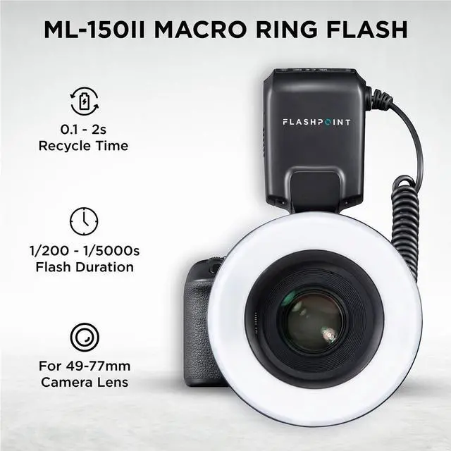 With a wide variety of adapter rings included, the ML-150 II is compatible with lenses featuring filter threads of 49, 52, 55, 58, 62, 67, 72, and 77mm, making it a versatile addition to any photography kit. Experience the ease and convenience of close-up photography with the Flashpoint ML-150 II Macro Ring Flash.