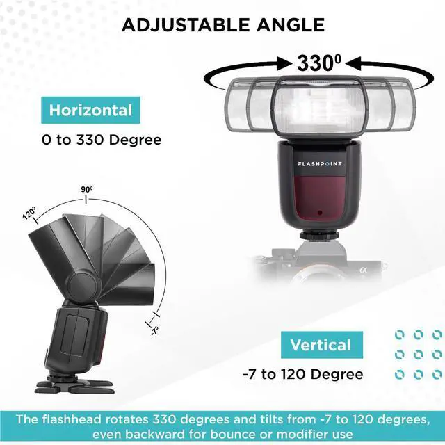 The flashhead rotates 330 degrees and tilts from -7 to 120 degrees, even backward, for bounce or modifier use. It zooms automatically or manually from 20-200mm, ensuring the necessary flash coverage without wasted spill. The unit also features a metal flash shoe with a locking pin for secure attachment to your camera or mount.