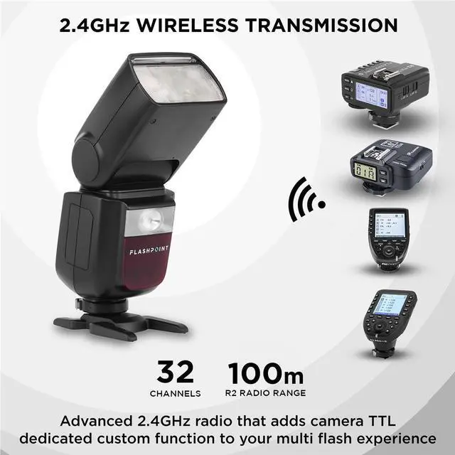 The metal flash shoe features a locking pin for added security, preventing accidental falls. Remote power control using a Flashpoint R2 System Transmitter or R2 Family flash allows for off-camera work from more than 150 feet away.