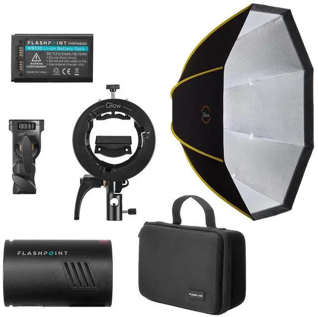 It features an LED modeling bulb for accurate color representation and variable zoom flash coverage, making it a versatile addition to any photographer's toolkit. The bundle also includes the Glow ParaSnap Octa 36" Softbox, a quick and easy-to-set-up lighting modifier that provides flattering, soft light for portraiture. The softbox features a revolutionary SterlingFibre silver lining, designed to optimize and maximize light output, ensuring no hot spots or light loss. Its removable inner and outer diffusers offer further control over the light quality, making it suitable for capturing a range of skin tones and values.