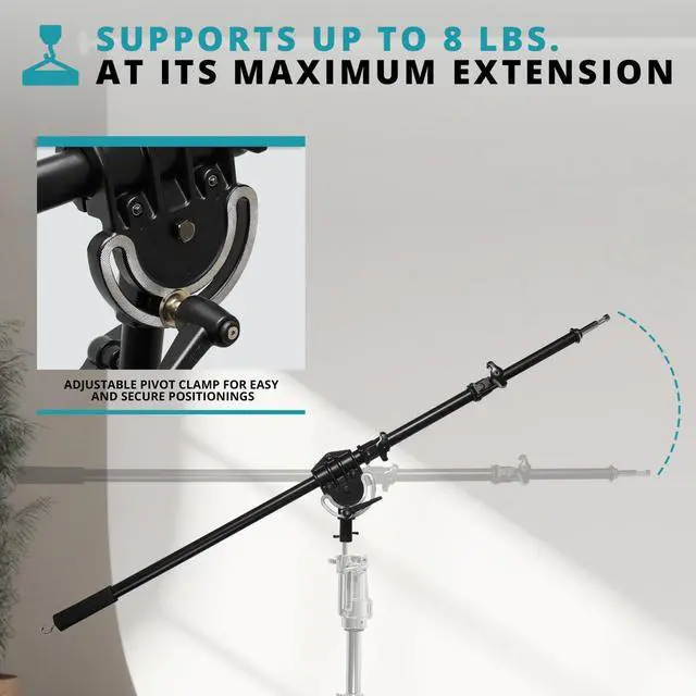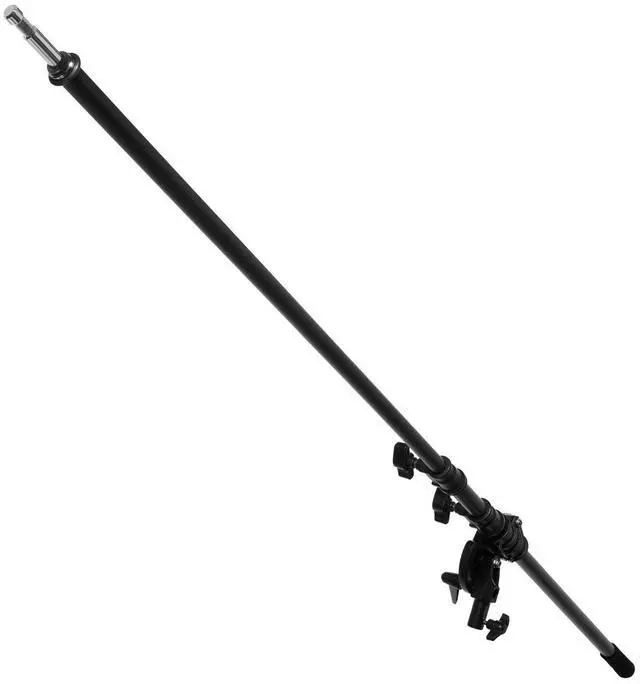 The jaws open to a maximum of 1-1/8" to hold rods, dowels, and studs. The channel disks pivot around the center tightening handle and are grooved for a firm friction hold. The Flashpoint Chrome-Plated 86" Boom Arm, included in the kit, is designed to deliver steady and dependable overhead lighting. This black chrome-plated steel boom arm telescopes from 46 to 86 inches in length and supports up to 8 lbs. at its maximum extension. It features a ratcheting pivot clamp handle for secure positioning and a rubber-coated section for comfortable and secure height adjustment on the counterweight hook.