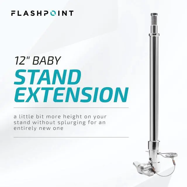 The Flashpoint Baby Stand Extension also boasts a 5/8" top stud, thoughtfully designed with a knurled surface to prevent unwanted rotation of your equipment. This ensures a stable and secure setup, enhancing the safety of your gear. Whether you're a professional photographer or a hobbyist, the Flashpoint 12" Baby Stand Extension is a high-quality, reliable addition to your photography equipment collection, designed to enhance your shooting experience by providing the extra height you need.